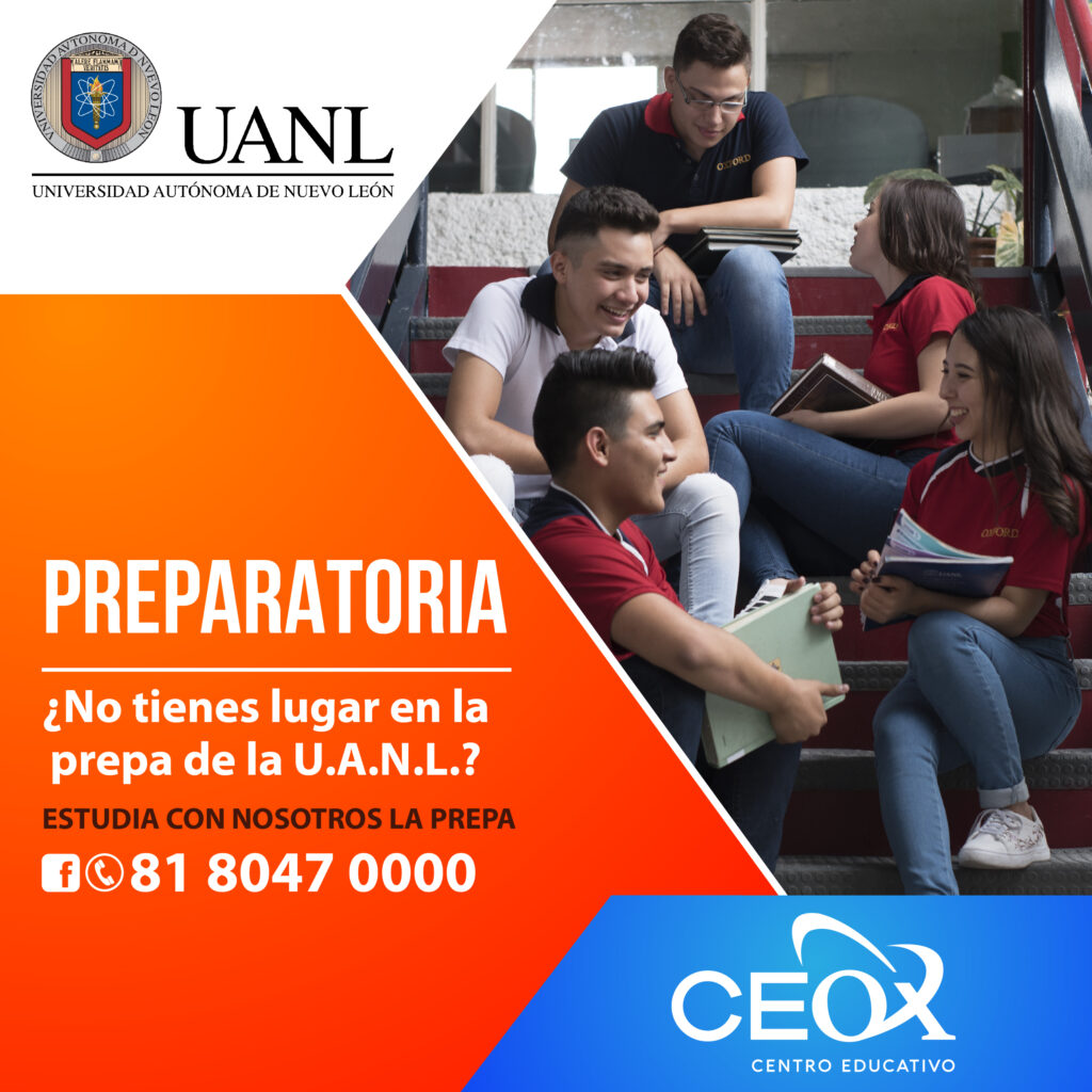 CEOX cENTRO EDUCATIVO Preparatoria • Licenciatura • Posgrados Más de 60 años desarrollando líderes exitosos ¿Presentaste el examen de admisión para la preparatoria de la U.A.N.L. y no obtuviste un lugar? En CEOX puedes estudiar la Preparatoria incorporada a la U.A.N.L. con validez oficial.Consulta las escuelas incorporadas: https://www.uanl.mx/incorporadas/Visita la página oficial de UANL: https://www.uanl.mx Contacto
